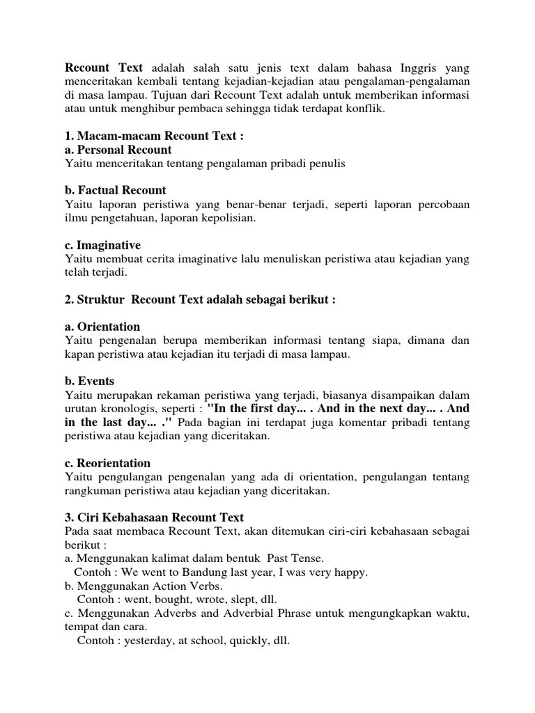 Pengertian, ciri, tujuan, macam, dan generic structure dalam bahasa inggris beserta contohnya diulas lengkap oleh ibi . Sukarno dikenal sebagai presiden pertama republik indonesia. Recount text adalah salah satu jenis teks yang berisi cerita pengalaman kita di masa lampau. Berikut contoh teks recount pengalaman pribadi dalam bahasa inggris: Kumpulan contoh recount text bahasa inggris yang singkat tentang.